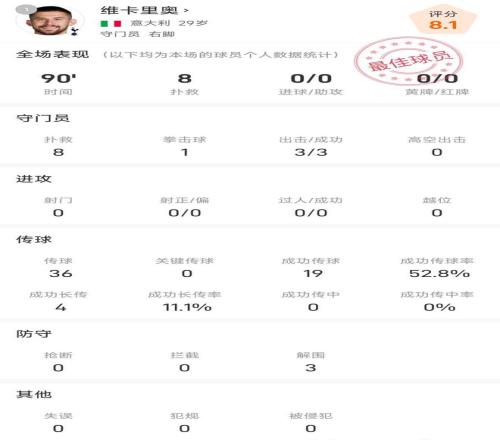 数据显示,本场比赛维卡里奥除了8次扑救,还有1次拳击球,3次出击也全部成功。