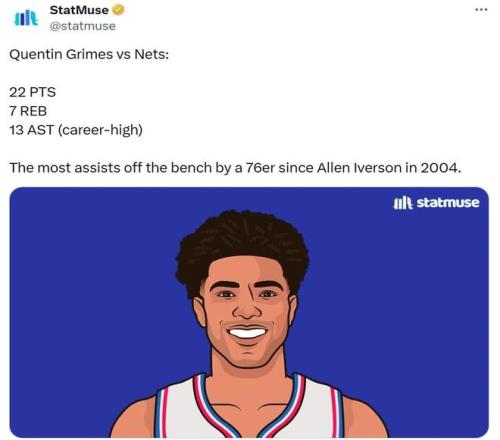 凭借这样的表现,格莱姆斯成为04年艾弗森后,76人队史首位以替补身份做到这点的球员。