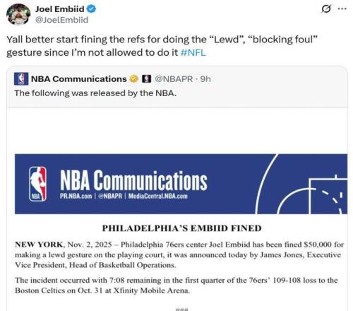 在缺席比赛的同时,恩比德还收到了一张5万美元的罚单,由于恩比德在前一场对阵凯尔特人队的比赛中做出不雅的庆祝动作NBA官方对其处以5万美元罚款。