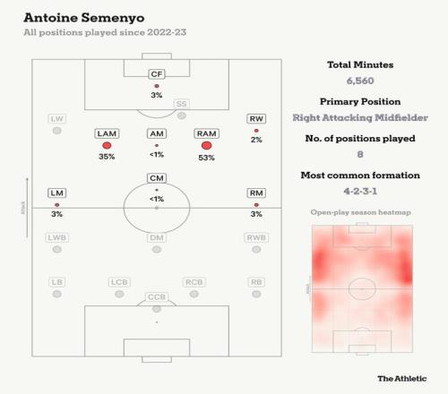 斯洛特希望他的边锋具备进球威胁并且在一对一情况下表现出色,而这正是塞门约擅长的领域。他的速度将为利物浦的锋线带来受欢迎的补充,而且他双脚均衡,可以胜任两翼。如下方图表所示,塞门约在位置上具有多面性。