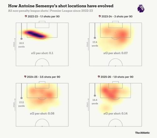 他理想情况下可以担任曼联3-4-3阵型中的右侧攻击型中场,但也能胜任两翼,并且具备防守意识,可以适应边翼卫的位置之一。阿莫林偏爱双脚均衡的边路球员,这使他能够指导锋线三人和边翼卫在进攻三区进行更多的轮转换位,从而更好地破解密集防守。这位加纳国脚快速的带球突破和大幅改善的射门状态(如下方图表所示,该图表显示他对射门的选择变得更加精挑细选),也将使他成为球队在由守转攻时的又一个出色的反击选择,而曼联在攻防转换阶段的威胁是最大的。