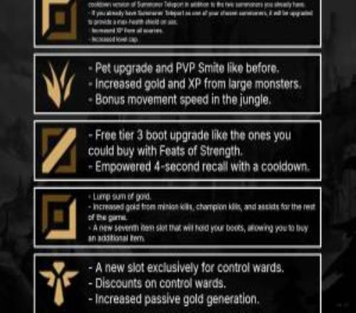 中路获得一个免费的3阶鞋子升级,类似之前抢占先机提供的可购买升级。此外,中路还会获得强化的4秒回城技能(有冷却时间)。部分3阶鞋子有所调整,但大部分与目前的版本类似。
